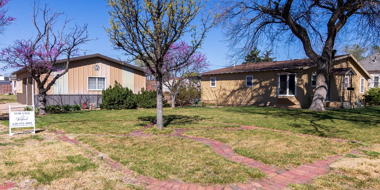 Come home to this one level space that sits on a large 140'x100' corner lot and features a lovely master suite with soaker tub, 2 separate sinks, large walk in closet with two turning show organizers, second bedroom with built-in desk and storage, expansive living room for entertaining, kitchen with lovely brick accents, main bath, laundry room, and back door mud room/drop zone. Enjoy your backyard landscaping and garden boxes. Spread out in the oversized two vehicle detached garage with storage, work bench, sink, water and sewer hook ups for potential half bath. Give Stephanie with Shapland Real Estate a call for more information at 620-874-5002.